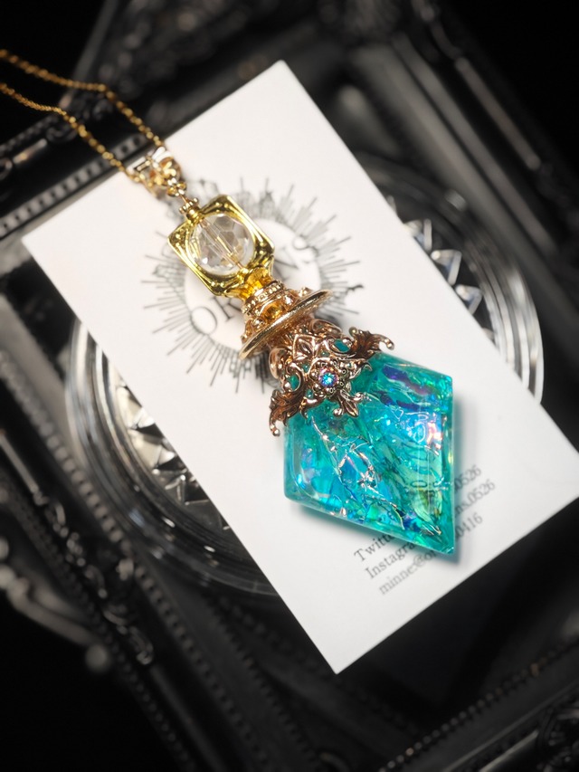 ⟡.·*.··············································⟡.·*. エレメンタルアミュレット アクアブルー&ターコイズ系 S ゴールドカラー×ターコイズ×オーロラシート T ゴールドカラー×アクアブルー U シルバーカラー×グリーンターコイズ×オーロラシート V シルバーカラー×ブルーターコイズ ✧••┈┈┈┈┈┈••✧ 精霊と心を通わせるための装身具 身につける者の心に静かに寄り添い守護する。 ✧••┈┈┈┈┈┈••✧ ※お使いのモニターによって見えるお色が異なることがございます エレメンタルアミュレットは通販では初の販売となります。 今回販売するものは初期に制作したデザインをリメイクし以前より強度を持たせました。 身につけていただくことを前提にした作品ですが、大ぶりのレジン作品なのでお部屋のインテリアとしてもオススメです。 本体サイズ 約縦7㎝ チェーン 60㎝ アジャスター5㎝ ⟡.·*.··············································⟡.·*. ◆注意事項・お手入れ方法◆ 個体によって小さな気泡がございます。 強度に気を使って制作しておりますが繊細なデザインの為、市販品のような強度はございません。お取り扱いの際はご注意下さい。 金属パーツは性質上変色、劣化が起こりやすい為、一定期間お楽しみいただくものとお考え下さい。また、レジンも変色しずらいものを使用しておりますが、金属パーツと同様、経年変化は免れない素材ですので、永年ではないことをご留意下さいませ。 お手入れ方法と致しましては、水分を含ませたティッシュや除菌用ウエットシートで汚れを落とし、最後に乾いた布やティッシュで水分をおふき取り下さいませ。 綺麗なお色で長くお楽しみいただきたい場合は、入れ物や箱の中で保管し、高温多湿を避け、日光に触れないようにしていだけるとより長持ちします。 ◆配送について◆ ネコポス 350円 ※追跡あり ◆初期不良・返品について◆ 商品ご到着時に初期不良や破損等ございましたら商品ご到着より7日以内にショップメッセージ、またはミンネのメッセージ機能にてご連絡くださいませ。期間を過ぎての場合は有料での対応となります。何卒ご了承くださいませ。 お客様都合のご返品はできかねます。何卒ご容赦くださいませ。