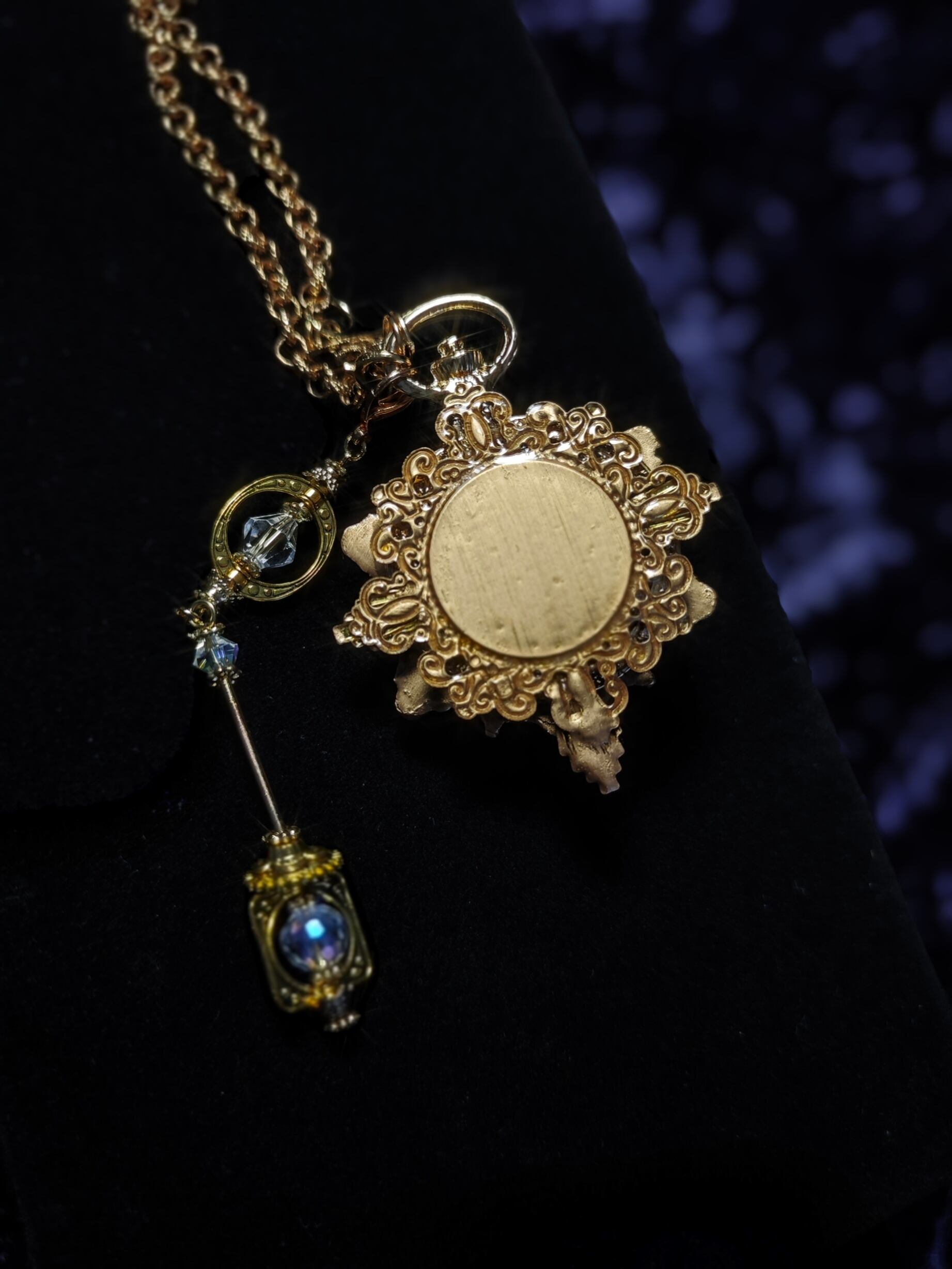 金具の色を統一するため一部のパーツを塗装しておりますが、裏面に関してはしっかりとレジンコーティングを施しているので、色移りなど起こらないよう工夫致しました。